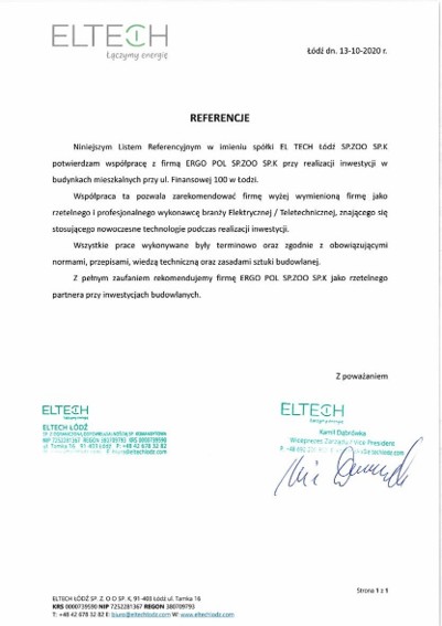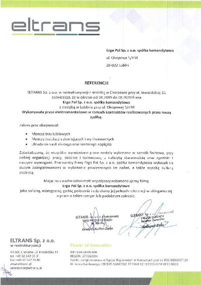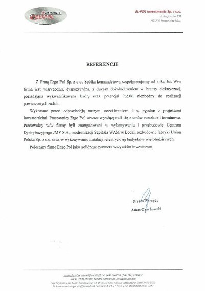 Z dumą prezentujemy opinie naszych Klientów, które potwierdzają profesjonalizm i zaangażowanie Elektro-Mon. Każde z naszych zrealizowanych zadań spotkało się z entuzjastycznym przyjęciem, świadcząc o wysokiej jakości usług i indywidualnym podejściu. Referencje pokazują nasze kompetencje, zaufanie inwestorów i inspirują nas do dalszych działań. Zapraszamy do współpracy nowych i stałych klientów. Serdecznie.